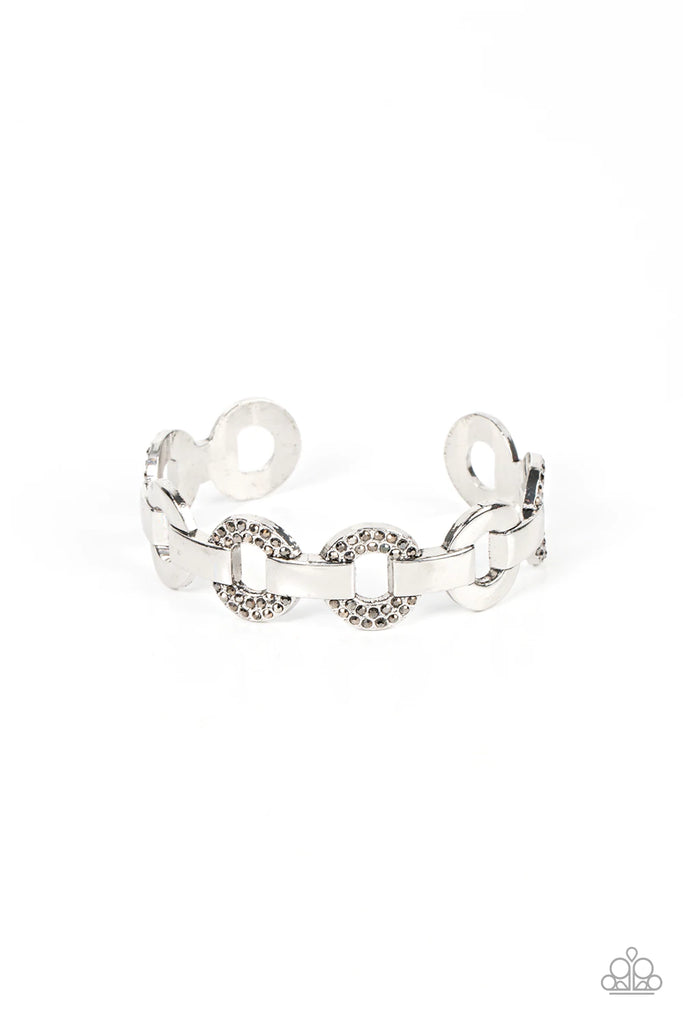 A refined collection of plain silver and hematite rhinestone encrusted silver links interlock with shiny silver fittings, creating a glamorous and gritty cuff around the wrist.