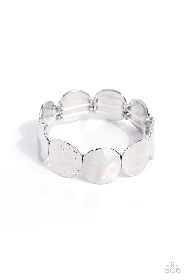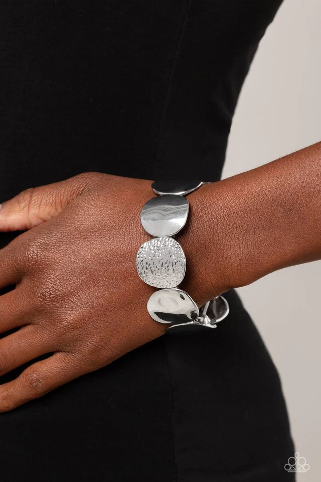 A hammered collection of asymmetrical silver discs are threaded along stretchy bands around the wrist for a refined flair. The silver discs feature both a rippling hammered effect and a more subtle hammered effect, creating a fashionable contrast amidst the same color.