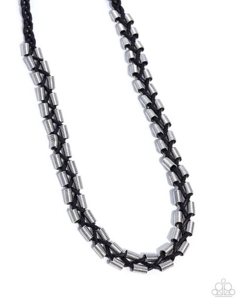 Featuring dainty silver beads that are rippling with ribbed textures, black suede cords decoratively braid and weave below the collar for an urban flair. Features a button loop closure.