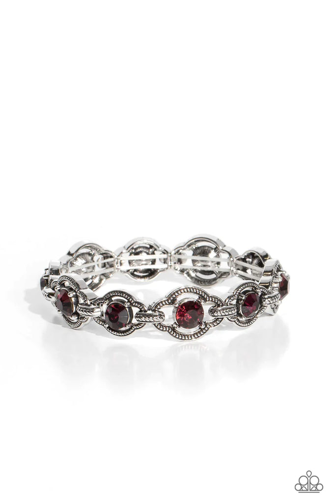 Purple gems are pronged and encircled inside elongated oval frames with scalloped edges, creating attention-grabbing pops of color around the wrist. Alternating in size, the elongated frames feature a decorative ropelike motif with matching rope-like silver links stretching across elastic bands for a wild industrial finish.