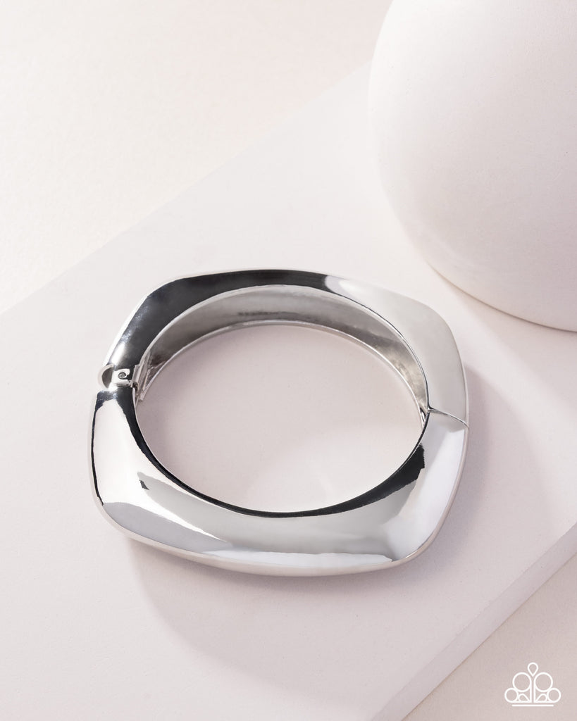 Featuring a sleek, high-sheen finish, a thick, rounded silver square cuff wraps around the wrist, creating a momentous monochromatic centerpiece. Features a hinged closure.