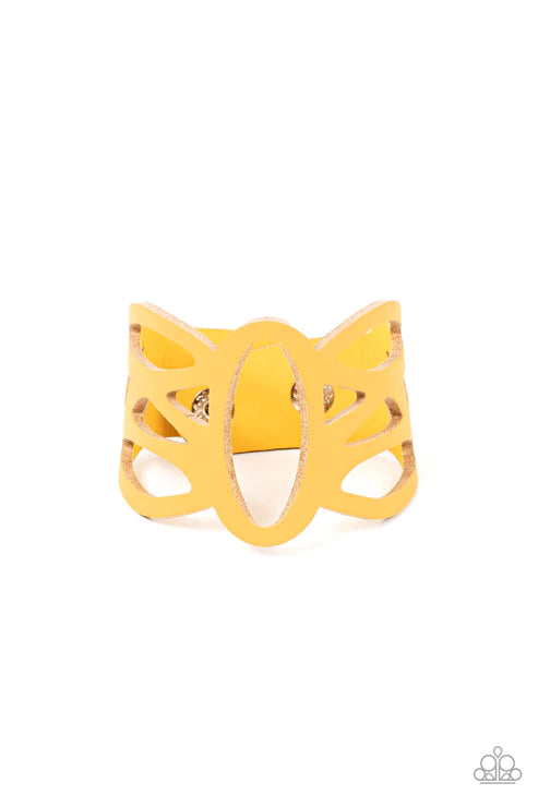 A golden yellow leather band has been ornately cut into an airy stenciled pattern, allowing the skin to peek through the leather silhouettes for a natural look. Features an adjustable clasp closure.