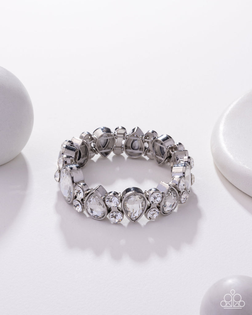 Infused along elastic stretchy bands, a collection of white teardrop gems in silver frames alternate in direction beside stacked white rhinestones also encased in elevated silver fittings for a dramatically dazzling display.