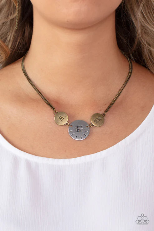 Individually stamped in "Let," "Your Light," Shine," a pair of rustic brass discs links with a single silver disc, combining into an inspirational phrase below the collar. Features an adjustable clasp closure.