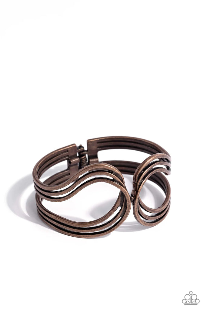 Featuring a rustic finish, flat copper bars delicately loop and overlap into two airy copper frames around the wrist that delicately connect into a layered bangle-like bracelet. Features a hinged closure.