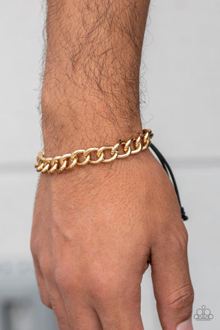 Shiny black cording knots around the ends of a classic gold cable chain that is wrapped across the top of the wrist for a versatile look. Features an adjustable sliding knot closure.