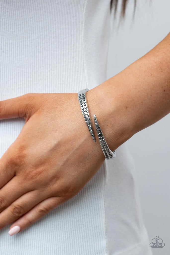 Dotted in rows of smoldering hematite rhinestones, two silver bars delicately curl and overlap across the center of the wrist. Featuring angled edges, the overlapping bars connect to hinged closures for a versatile bangle-like finish. Features a hinged closure.