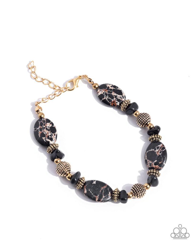 Infused along an invisible string, a collection of highly-textured antiqued gold beads, chiseled black stones, antiqued gold beads, and black-marbled oval stones pattern and alternate along the wrist for a pop of southwestern-inspired color and chic. Features an adjustable clasp closure. As the stone elements in this piece are natural, some color variation is normal.