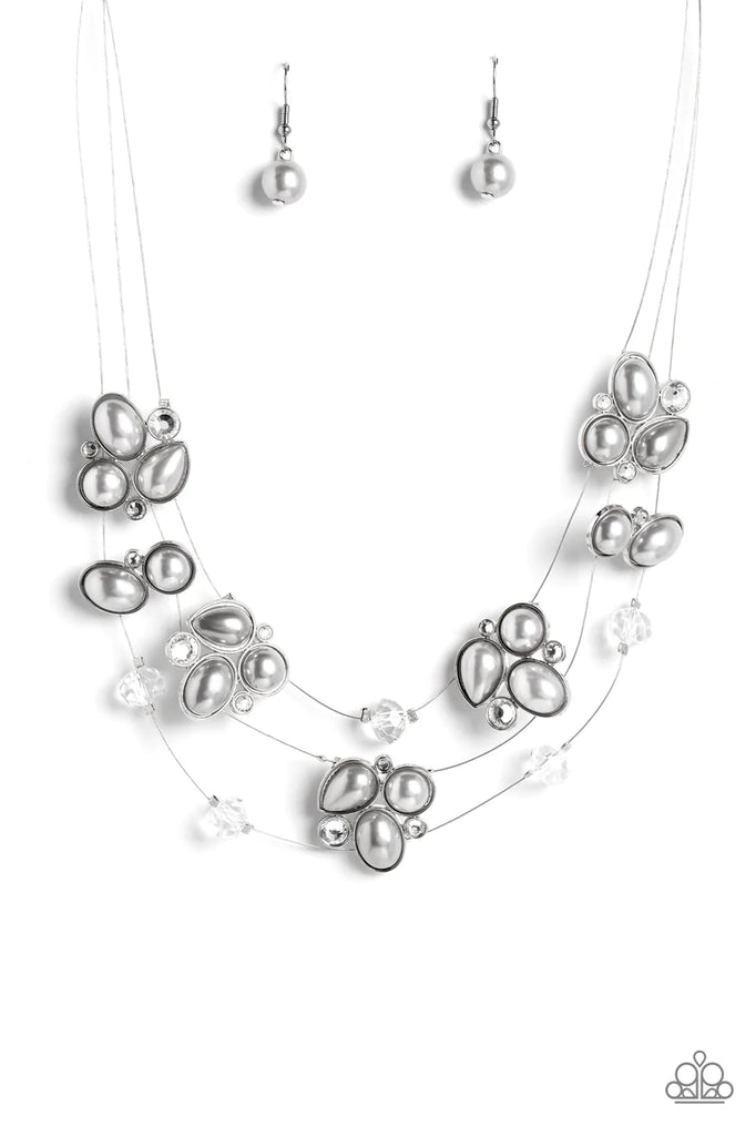 Strung along a trio of delicate silver wires, an ethereal collection of white crystal-like gems, clear faceted beads, and timeless gray pearls are pressed into teardrop, oval, and circular frames as they cluster along the collar. The mismatched clusters of sparkle and refinement seemingly float across the neckline, emitting an air of effortless elegance. Features an adjustable clasp closure.