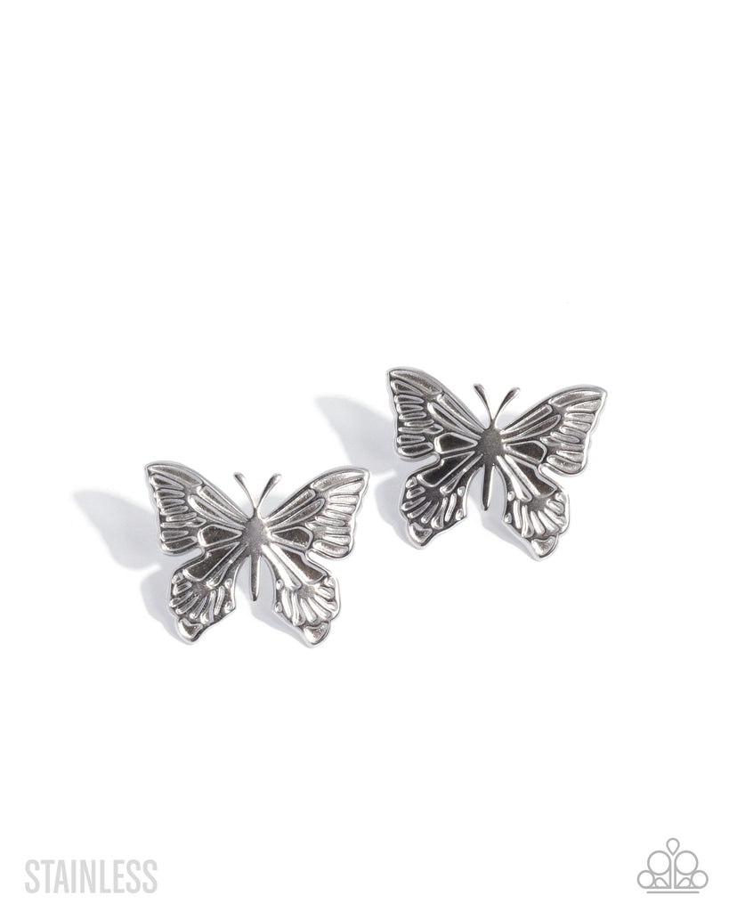A glistening, detailed stainless steel butterfly flutters atop the ear for a whimsically timeless look. Earring attaches to a standard post fitting.