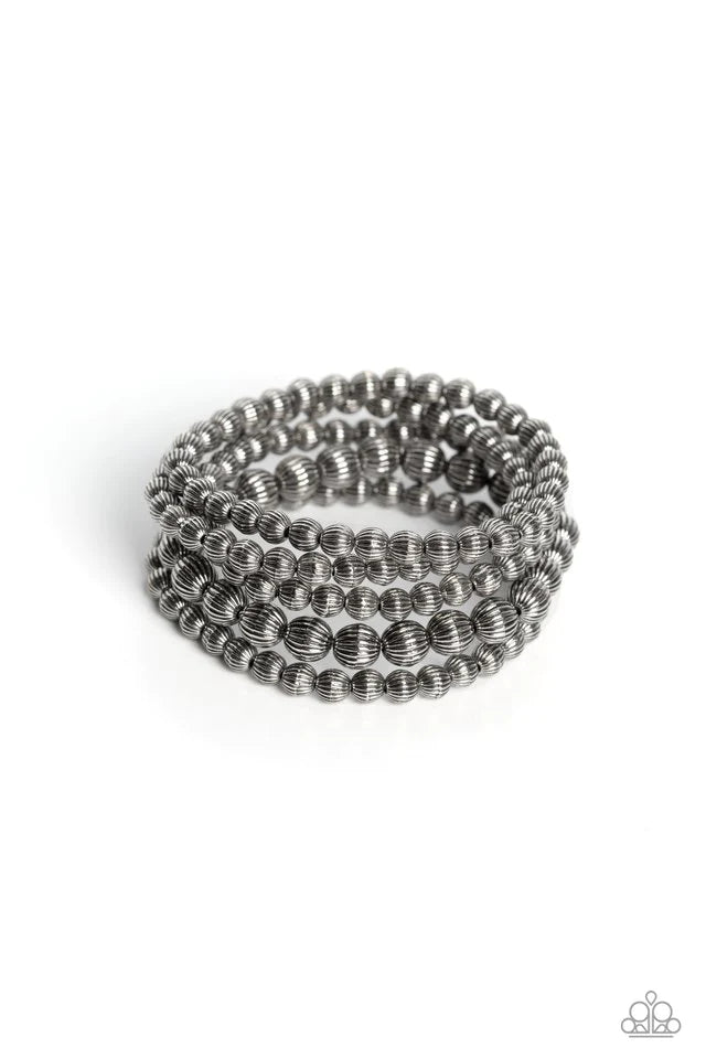 Gritty strands of silver beads etched in linear patterns wrap around the wrist on stretchy bands. One strand of the linear silver beads features bigger beads than the rest of the collection for an earthy contrast to the design.