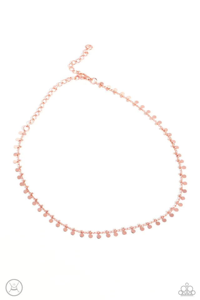 Featuring beaded fittings, a dainty collection of shiny copper discs glisten from the bottom of a dainty shiny copper chain around the neck for a minimalist inspired style. Features an adjustable clasp closure.