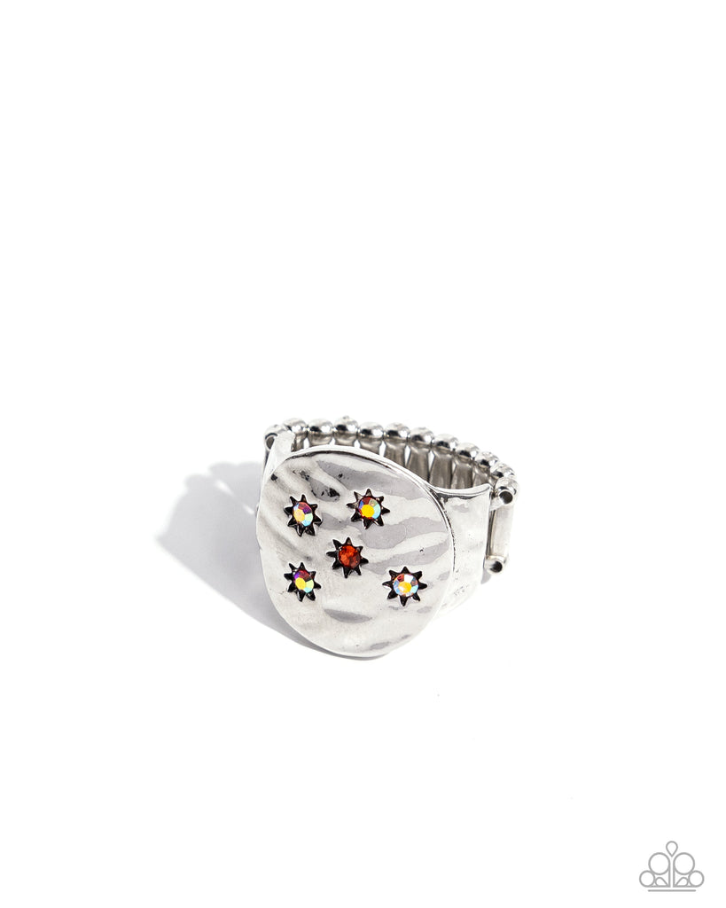 Featuring a hammered surface, multicolored orange and orange iridescent stars twinkle across a silver “sky” for a stellar centerpiece atop the finger. Features a stretchy band for a flexible fit. Due to its prismatic palette, color may vary.