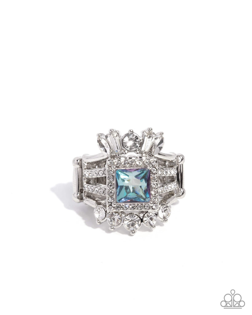 A faceted, square-cut iridescent light blue rhinestone is pressed at the center of a gleaming silver frame. White baguette, round, and oval-cut white rhinestones line the top, and a row of round-cut white gems line the bottom, creating a regal, crown-like display of sparkle and dimension. Features a stretchy band for a flexible fit.