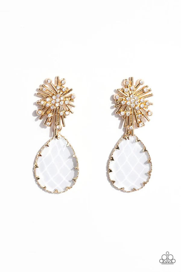 An explosion of radiating gold bars is topped with a sprinkle of white rhinestones, creating a stellar anchoring point. Swinging below the starburst, an oversized, clear teardrop with a light-catching, faceted surface is wrapped in a textured border of gold, adding stunning dimension and refinement to the cosmic combination.