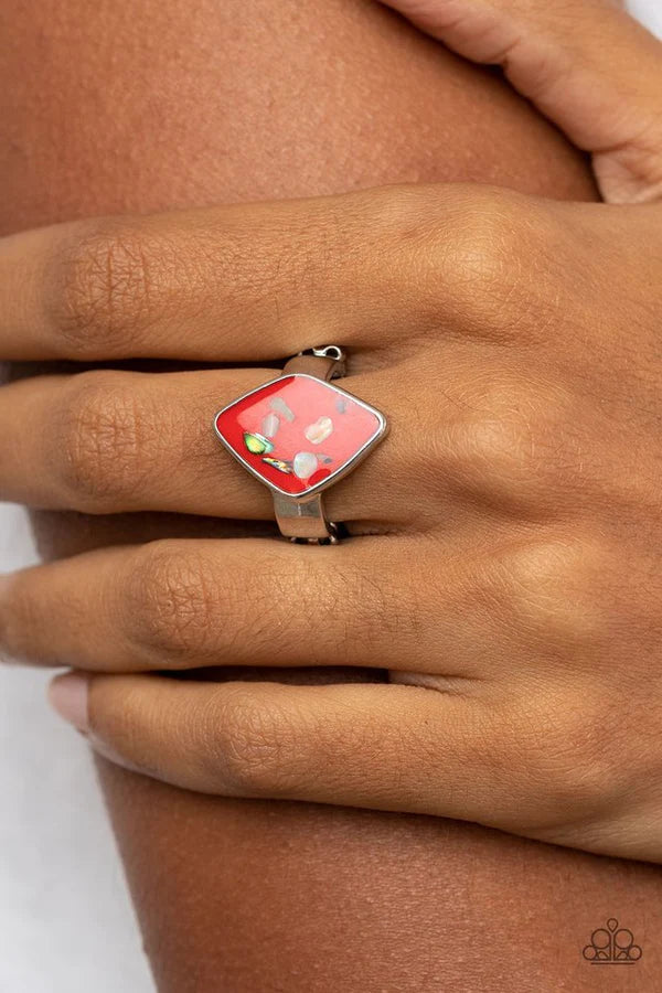 Flecks of shell-like accents glisten atop a burnt red backdrop, resulting in a glassy frame atop the finger. Features a dainty stretchy band for a flexible fit.