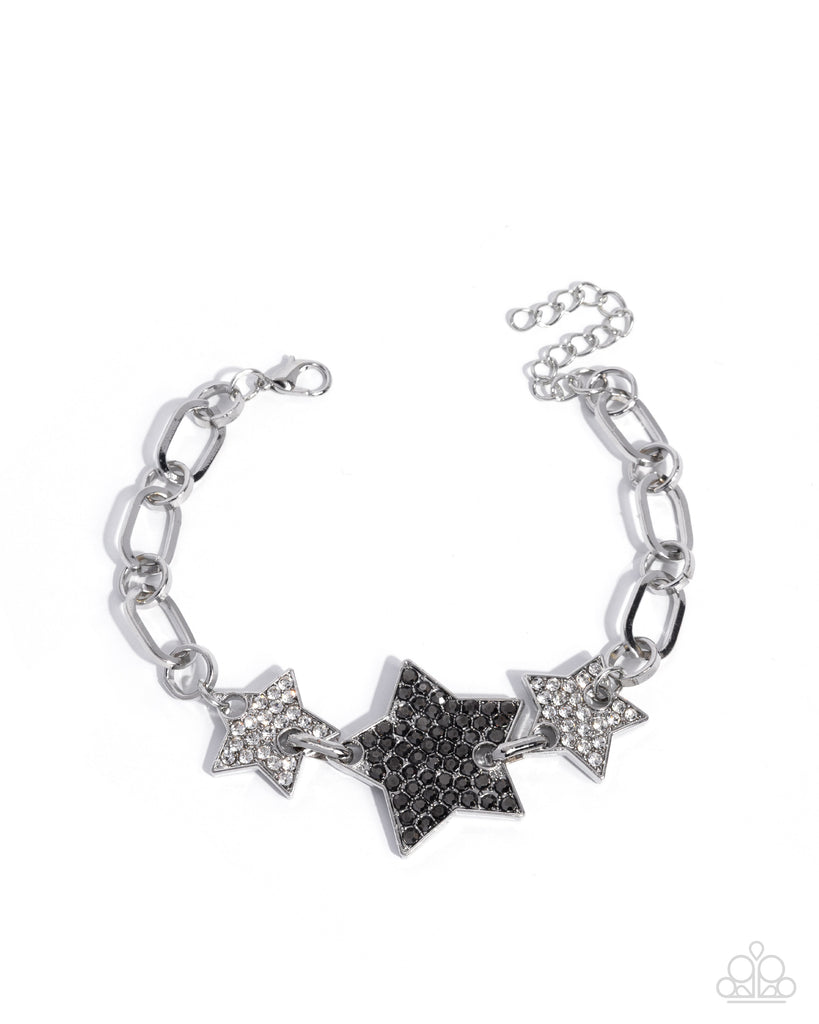 Embellished in white and hematite rhinestones, a trio of varying sizes of silver stars meets at the center of the wrist along an abstract silver chain for a cosmically chic display. Features an adjustable clasp closure.