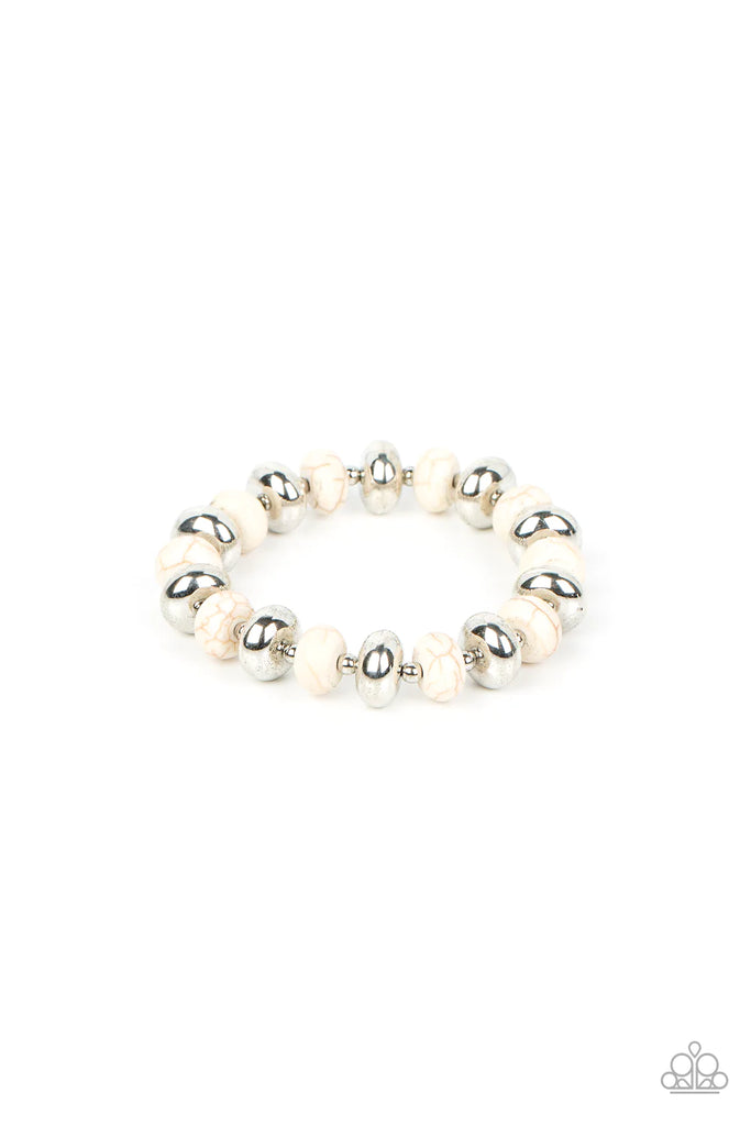 Separated by dainty silver beads, rounded silver accents and white stone beads alternate along a stretchy band around the wrist for an adventurous pop of artisan inspired color.