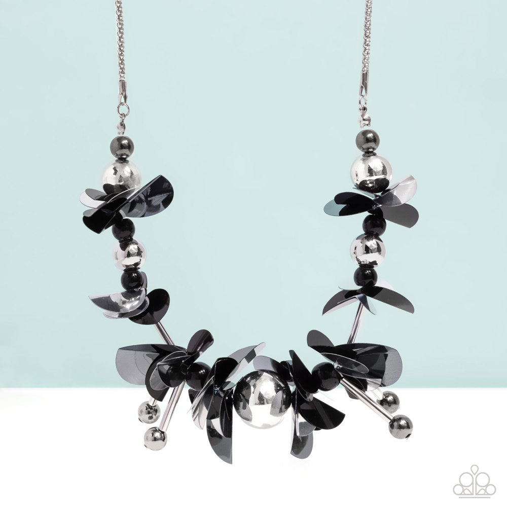 Attached to a dainty silver box chain, a collection of gunmetal, black, and silver spheres are haphazardly interrupted by gunmetal and black sequins and cylindrical silver beads for a sassy, streamlined statement below the neckline. Features an adjustable clasp closure.