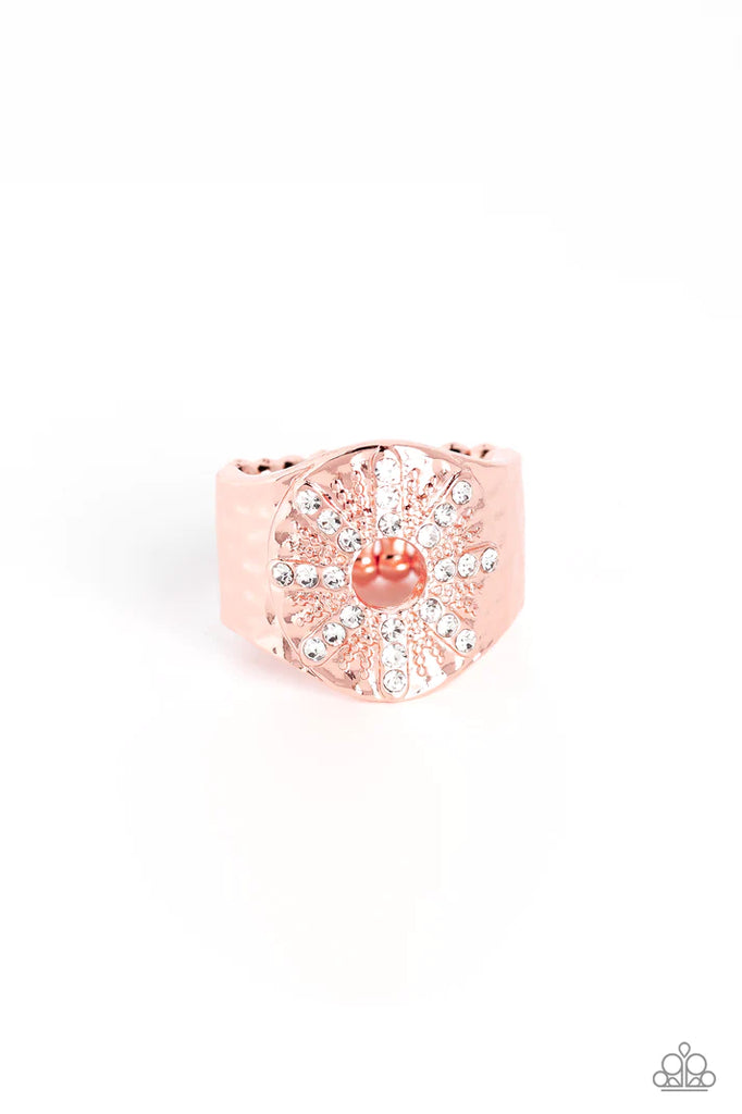 Dainty white rhinestones alternate with textured shiny copper studs around an airy center, creating a radiant sunburst pattern that fans out atop a hammered shiny copper band for an optimistic finish. Features a stretchy band for a flexible fit.