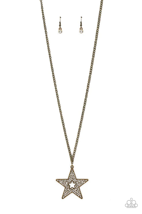 Blinding white rhinestones are encrusted across the front of an oversized brass star frame at the bottom of a lengthened brass chain, resulting in a stellar sparkle. Features an adjustable clasp closure.