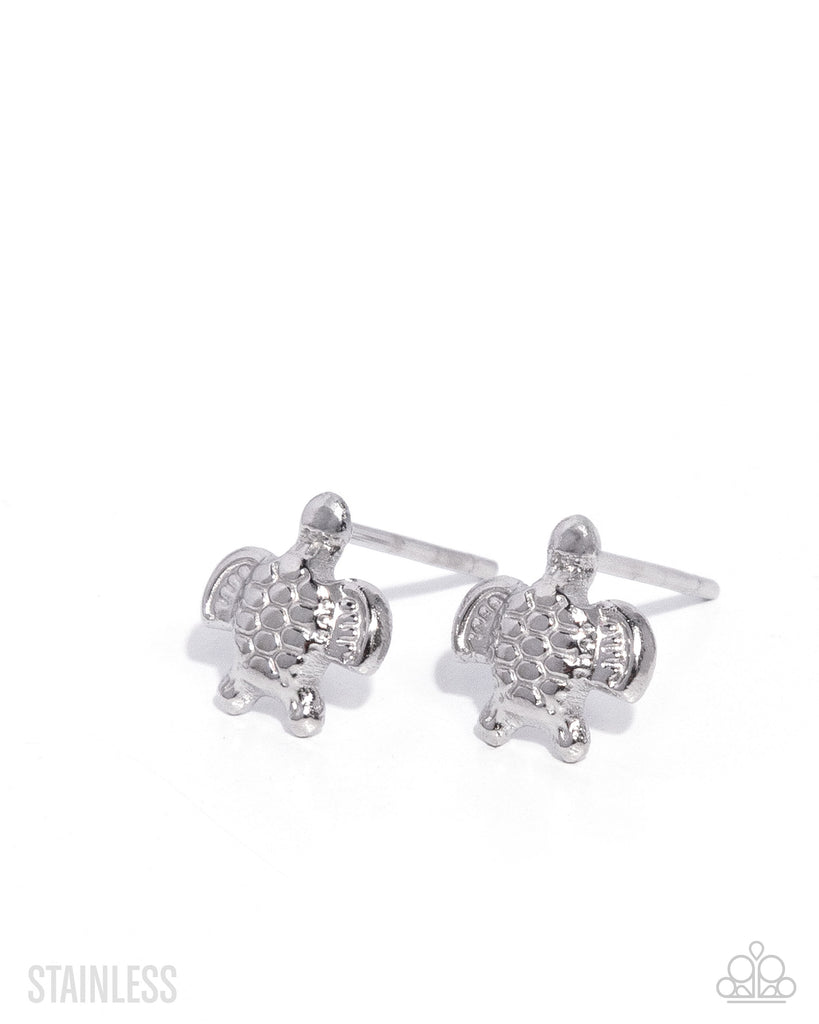 Featuring stainless steel, a dainty, textured sea turtle glistens atop the ear for a classic, coastal display. Earring attaches to a standard post fitting.