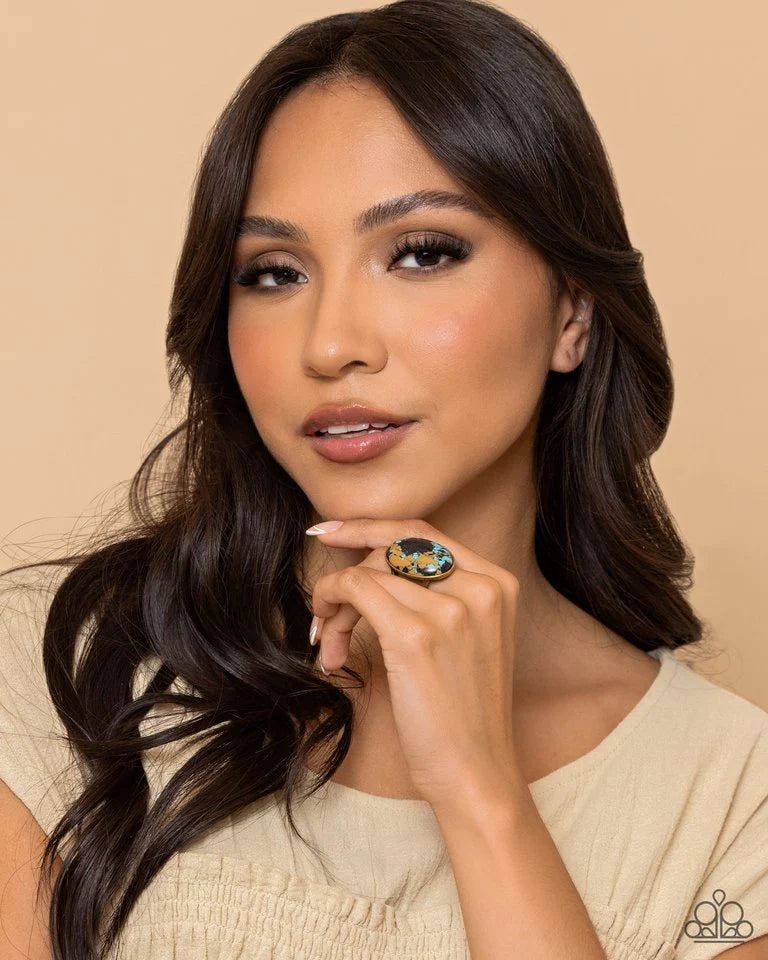 Featuring multicolored flecks, an oversized, oval-cut terrazzo stone is pressed into a simple brass frame creating a funky style atop the finger. Features a stretchy band for a flexible fit. As the stone elements in this piece are natural, some color variation is normal.