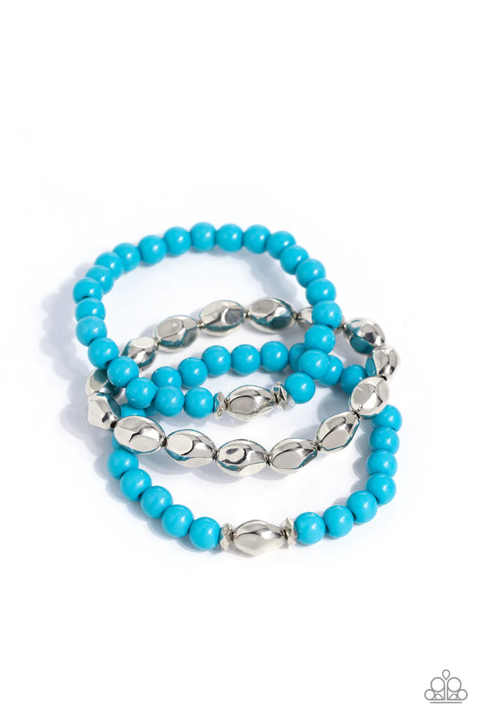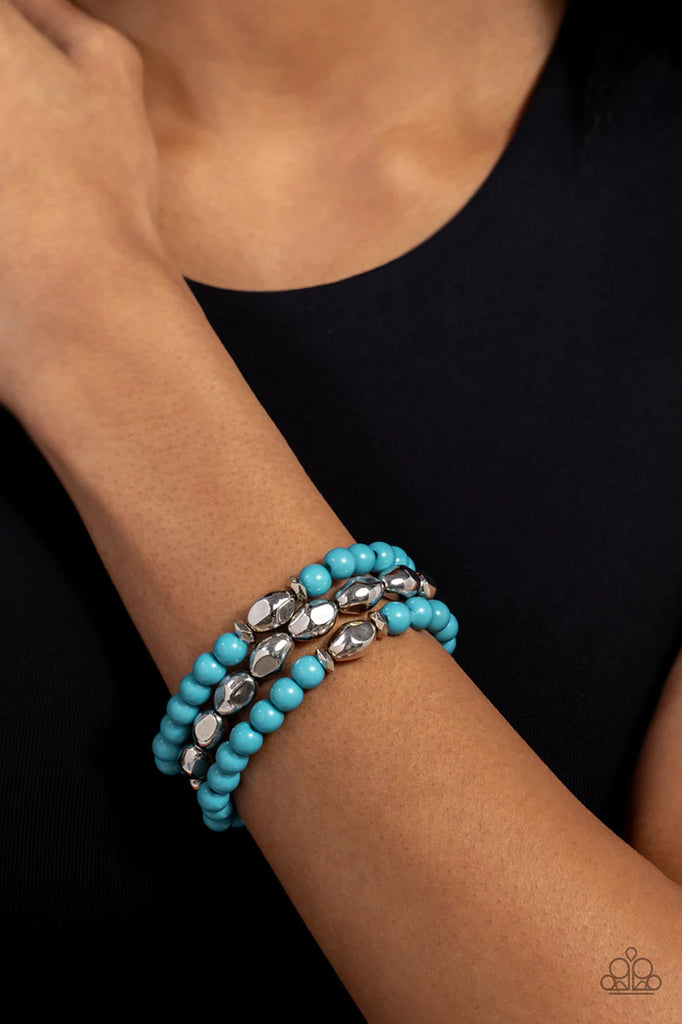 Vibrant turquoise beads mix with warped, silver rhombus beads to create a colorfully geometric statement around the wrist. Strung on elastic stretchy bands around the wrist, silver accents create additional high-sheen detail on the sweet stack.