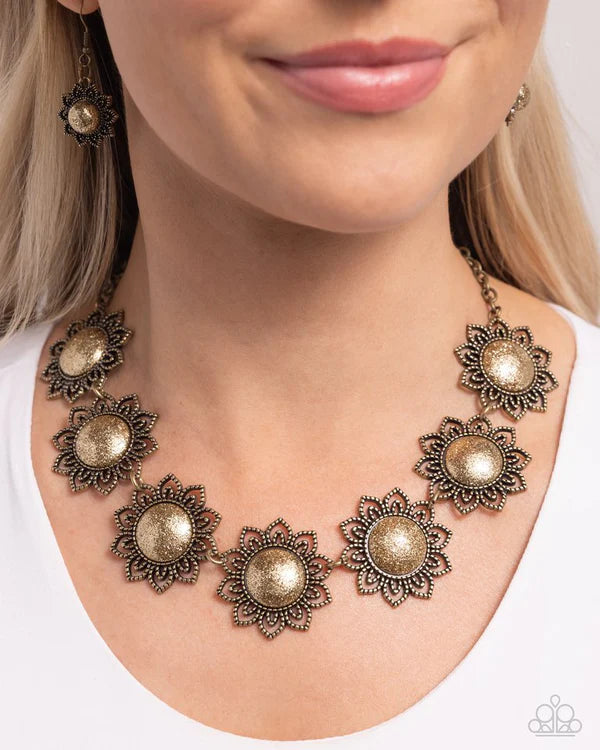 Studded in tactile detail, a collection ofbrassmandala-like floral frames with brass glittery centers connect below the collar from a classic brass chain for a gorgeous pop of color.