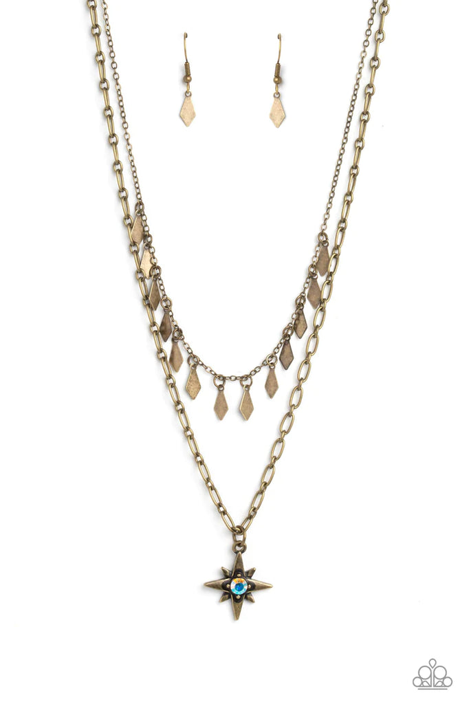A three-dimensional brass star, dotted with a single iridescent rhinestone glides on a paperclip chain down the neckline for an out of-this-world-vibe. Flat and flared brass frames dance above the star pendant from an uppermost chain, adding a gritty layered look to the refined palette. Features an adjustable clasp closure. Due to its prismatic palette, color may vary.