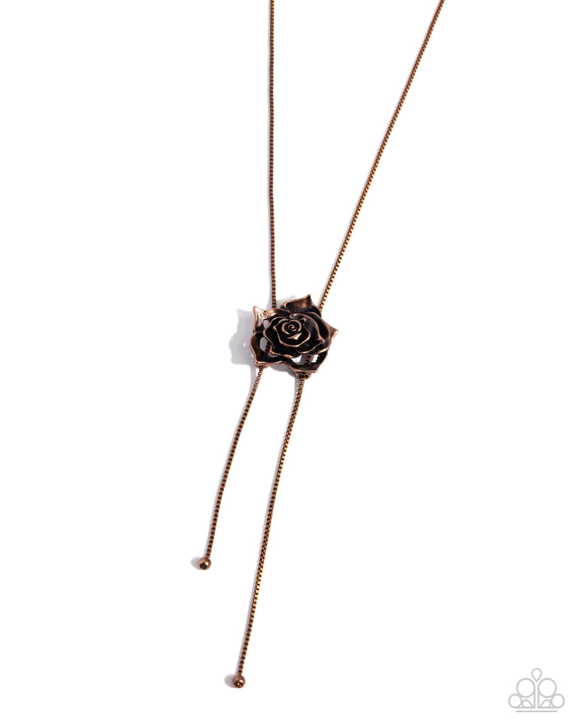 A dainty copper chain meets at a delicately sculpted rose pendant. The copper rose features intricate detailing, adding a romantic and vintage touch to the overall design. Features an adjustable bolo closure.