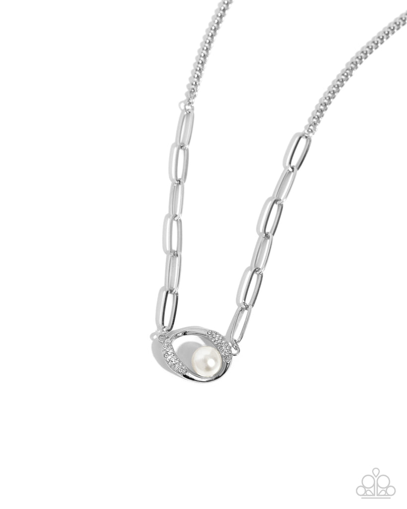 A classic silver chain gives way to silver paperclip chain links, connecting to a white rhinestone-dusted, horizontal silver ellipse pendant. A glossy white pearl is featured slightly off-center of the ellipse pendant for a ladylike finish. Features an adjustable clasp closure.