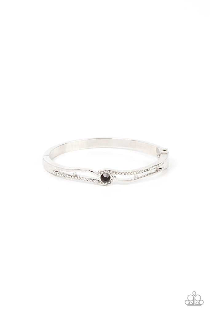 Ribbons of shiny silver and white rhinestone encrusted silver bars wrap around a glittery purple rhinestone center, resulting in a timeless shimmer atop a versatile bangle-like bracelet. Features a hinge closure.