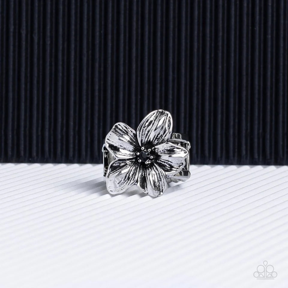 Dotted with dainty silver studs and a dainty jet black rhinestone center, folds of shiny silver gather into an oversized tropical flower for a whimsical dash of island inspiration. Two shimmery silver bars arc across the finger, creating an airy band. Features a stretchy band for a flexible fit.