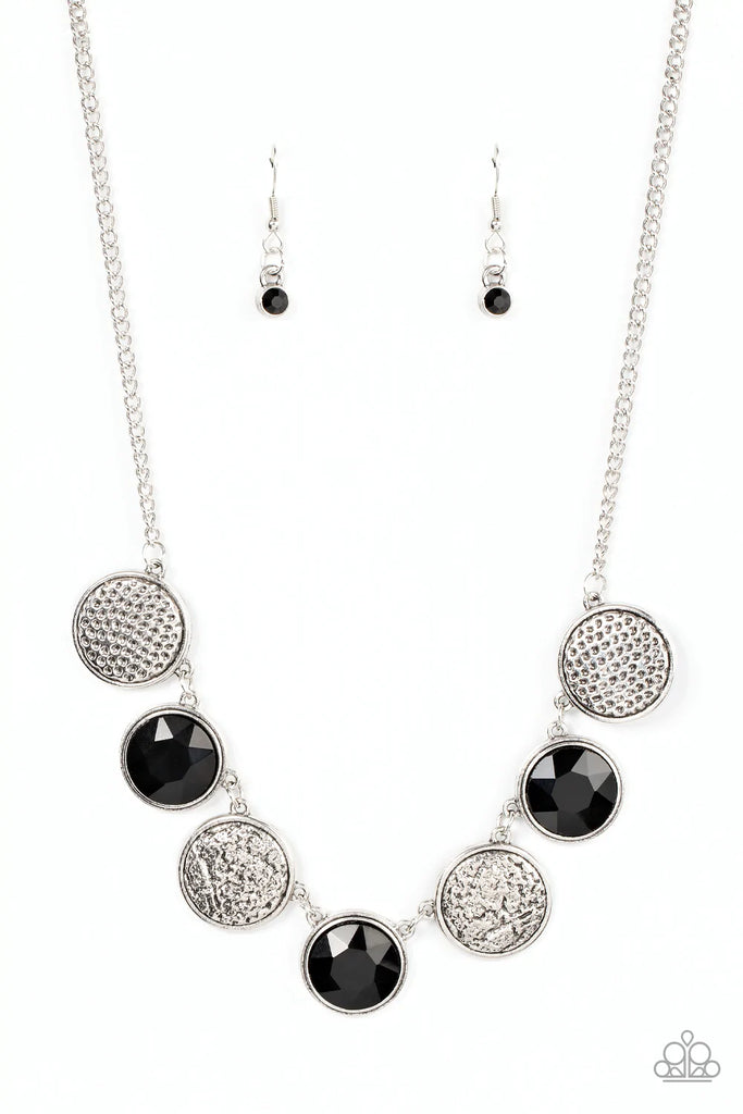 A gritty collection of hammered silver frames, oversized black rhinestones, and silver foiled-like frames delicately links below the collar, creating a sassy display of shimmer. Features an adjustable clasp closure.