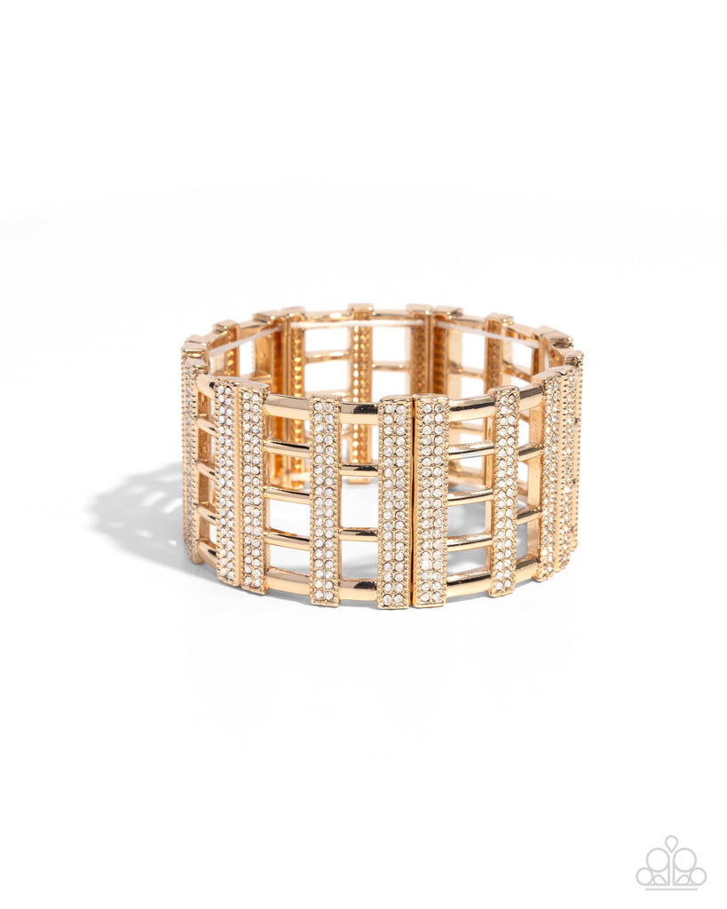 Threaded along invisible stretchy bands, a lattice-like structure of rectangular gold bars encrusted with dainty white rhinestones wrap around the wrist in a bold fashion.