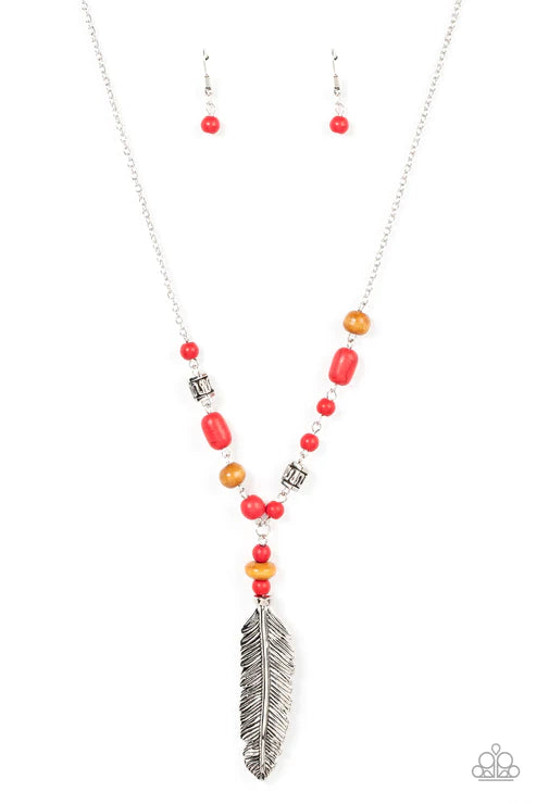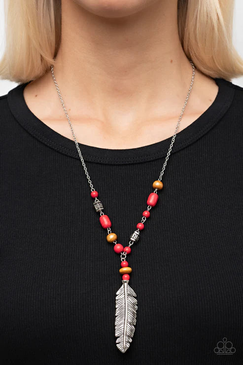 A lifelike silver feather swings from the bottom of a dainty silver bead adorned in wooden beads, red stones, and textured silver accents, resulting in a free-spirited pendant. Features an adjustable clasp closure.