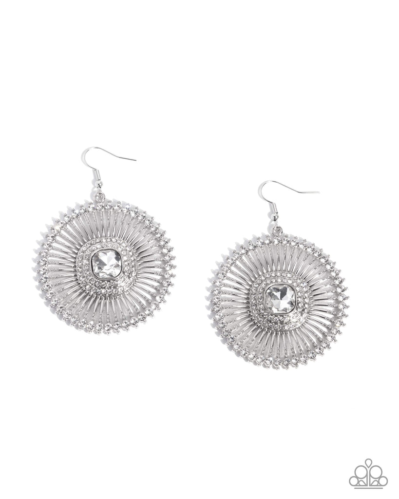 Bordered in dainty white rhinestones, a collection of textured silver spokes links around layered white rhinestones that lead the eye to an asscher-cut white gem centerpiece, for a dizzying edgy sparkle. Earring attaches to a standard fishhook fitting.