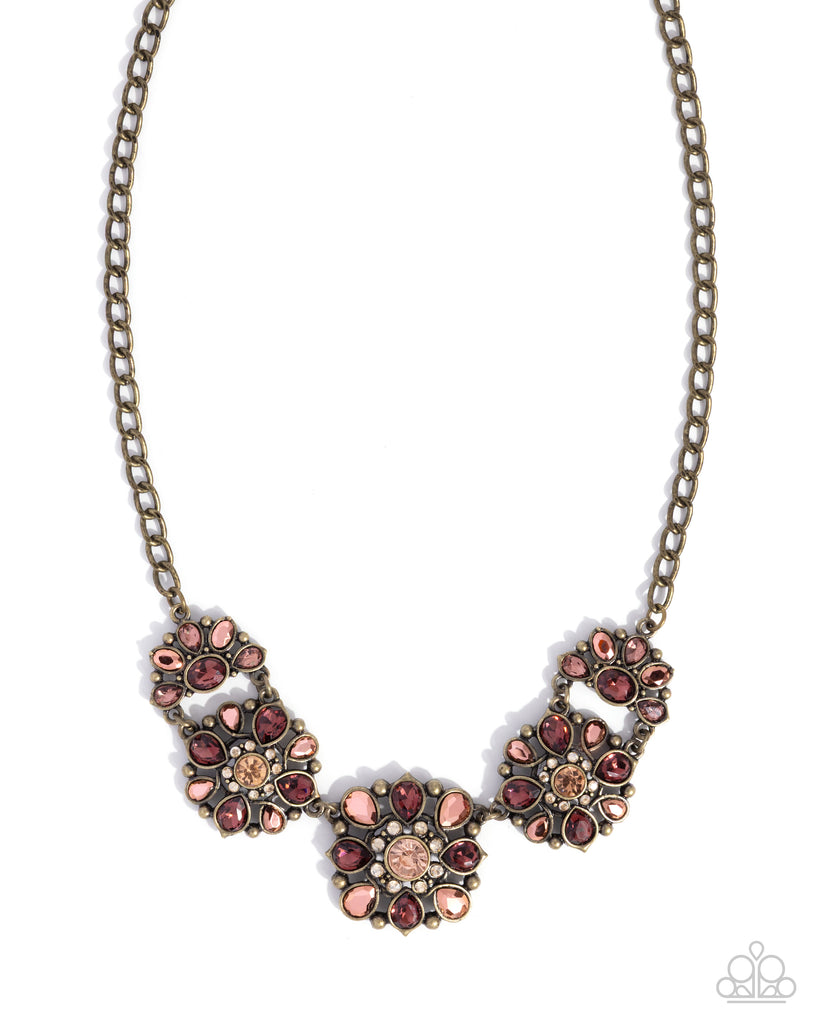 Pressed in brass-studded fittings, a glassy collection of various light peach, tea, Golden Shadow, and purple gems in teardrop, oval, and round cuts explodes from half and full brass flowers, resulting in a whimsically jaw-dropping dazzle that collects below the neckline from a brass curb chain. Features an adjustable clasp closure.