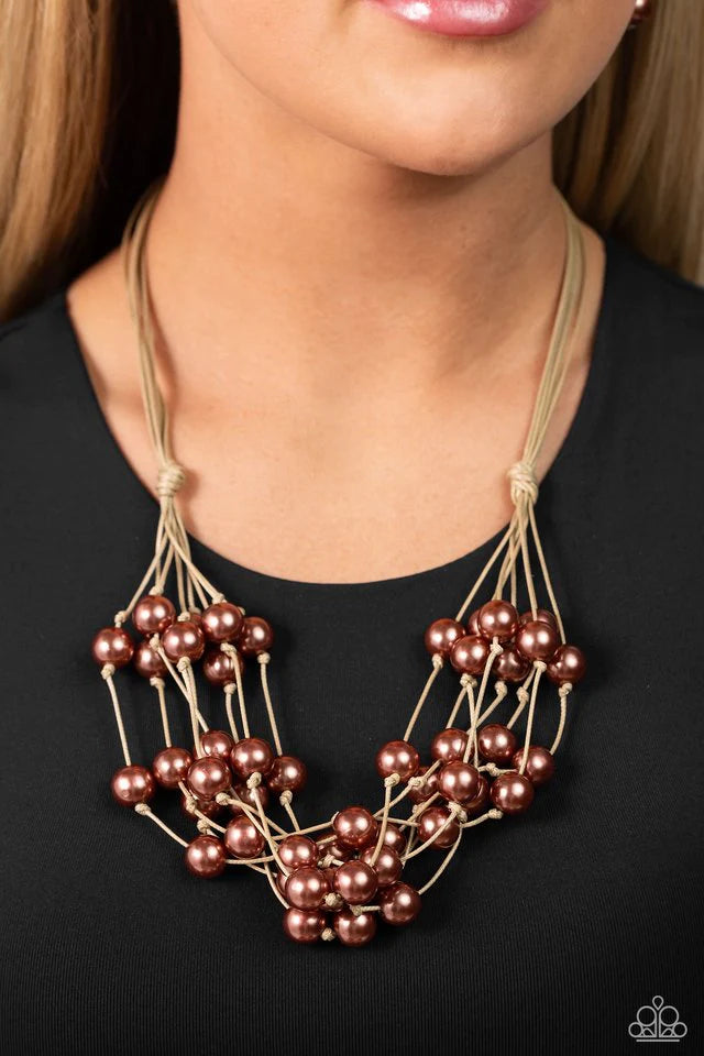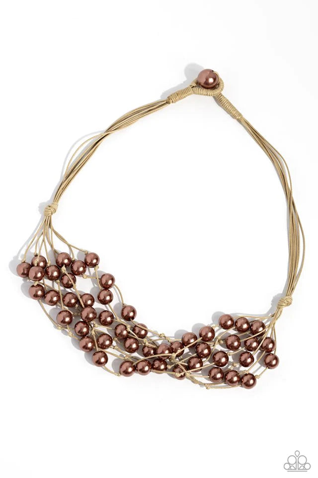 A collection of bubbly brown pearls are knotted in place along strands of shiny tan cording, resulting in boisterous layers below the collar. Features a button-loop closure.